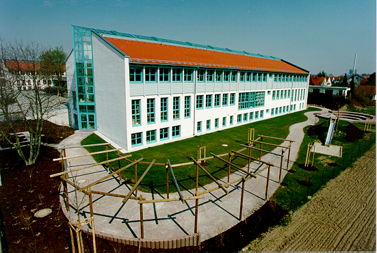 Der Bau des neuen Schulzentrums wurde im Jahr 1987 eingeleitet. Die heutige Schule weist drei Bauabschnitte auf. Der Mittelteil, der den Nord- und den Südtrakt miteinander verbindet, ist der Rest der Schule, die unter der Ära von Karl Wiesheu zwischen 1970-1972 erbaut wurde.